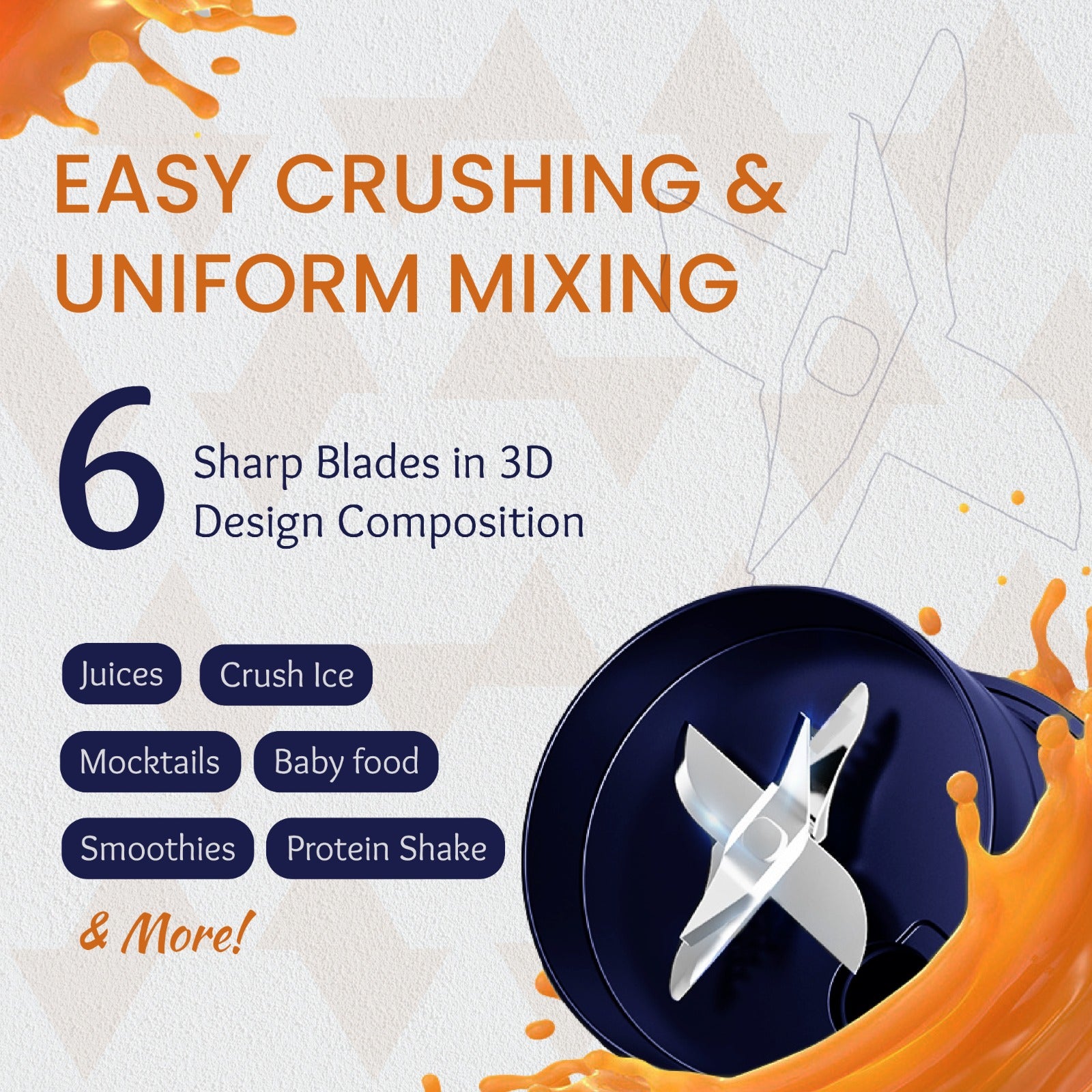 6 Sharp Stainless Steel Blades – For quick and efficient blending.